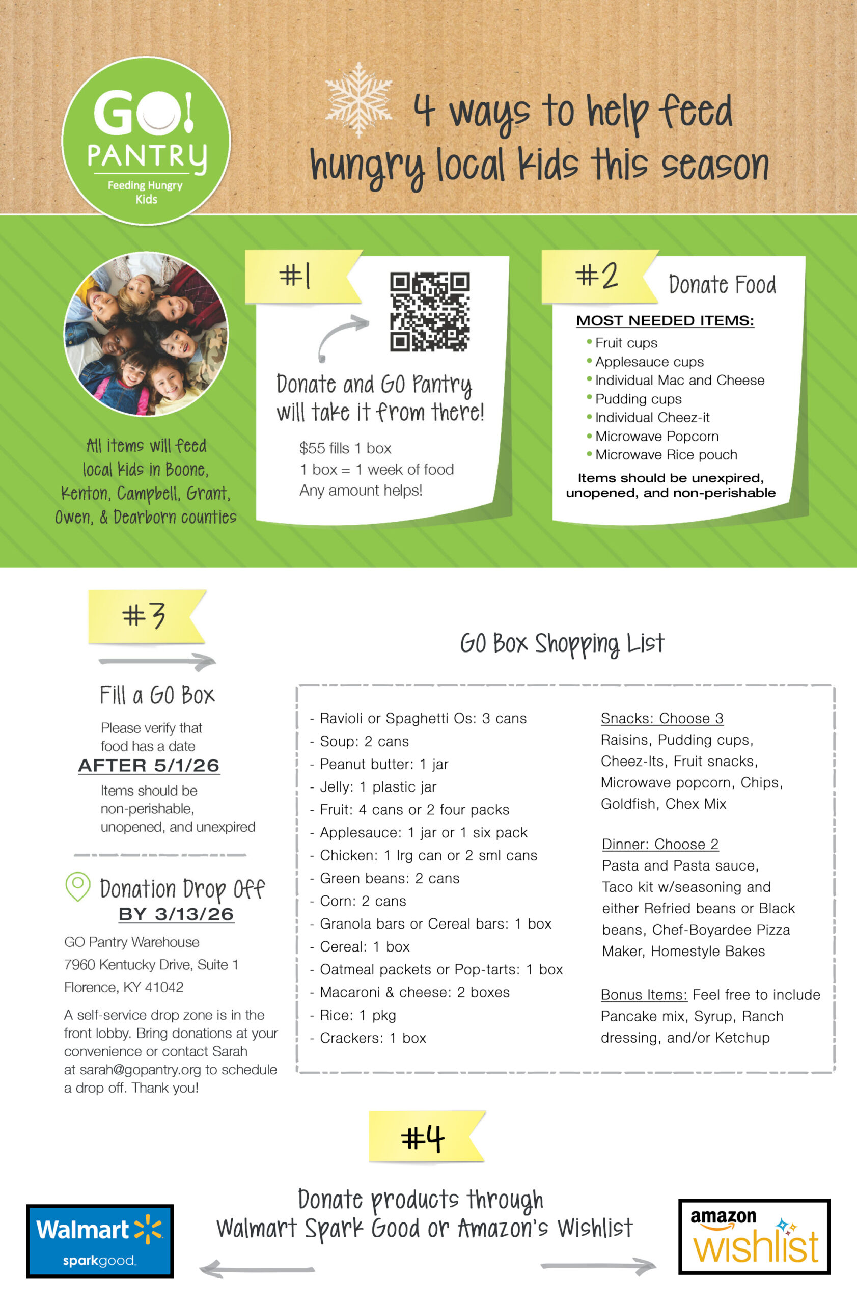 Not only will you collect much needed items, you will also help spread the word about GO Pantry the kids we are working so hard to help.
