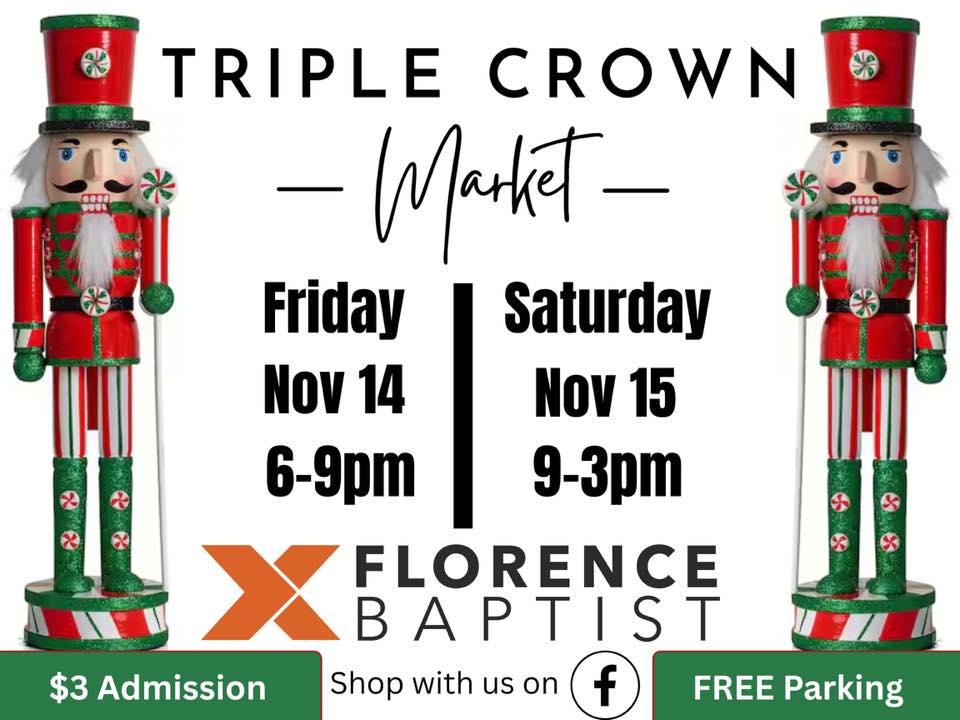 Get a jump start on your holiday shopping on Friday, November 14th and Saturday, September 15th at the Triple Crown Market, to be held at Florence Baptist Church. A portion of every $3 admission will be donated to GO Pantry to help feed local students who are experiencing food insecurity. Cross a few people off your shopping list, while supporting local businesses and your community! It’s a win-win! Hope to see you there!