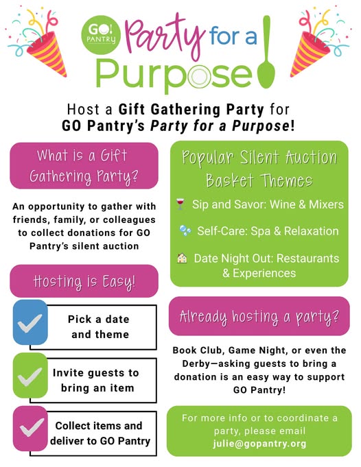 Do you have an upcoming party in the works? Does your team at the office get together for a monthly game night? Or do you and your gal pals have a book club that meets every other week? Turn those get-togethers into gift gathering parties for GO Pantry!